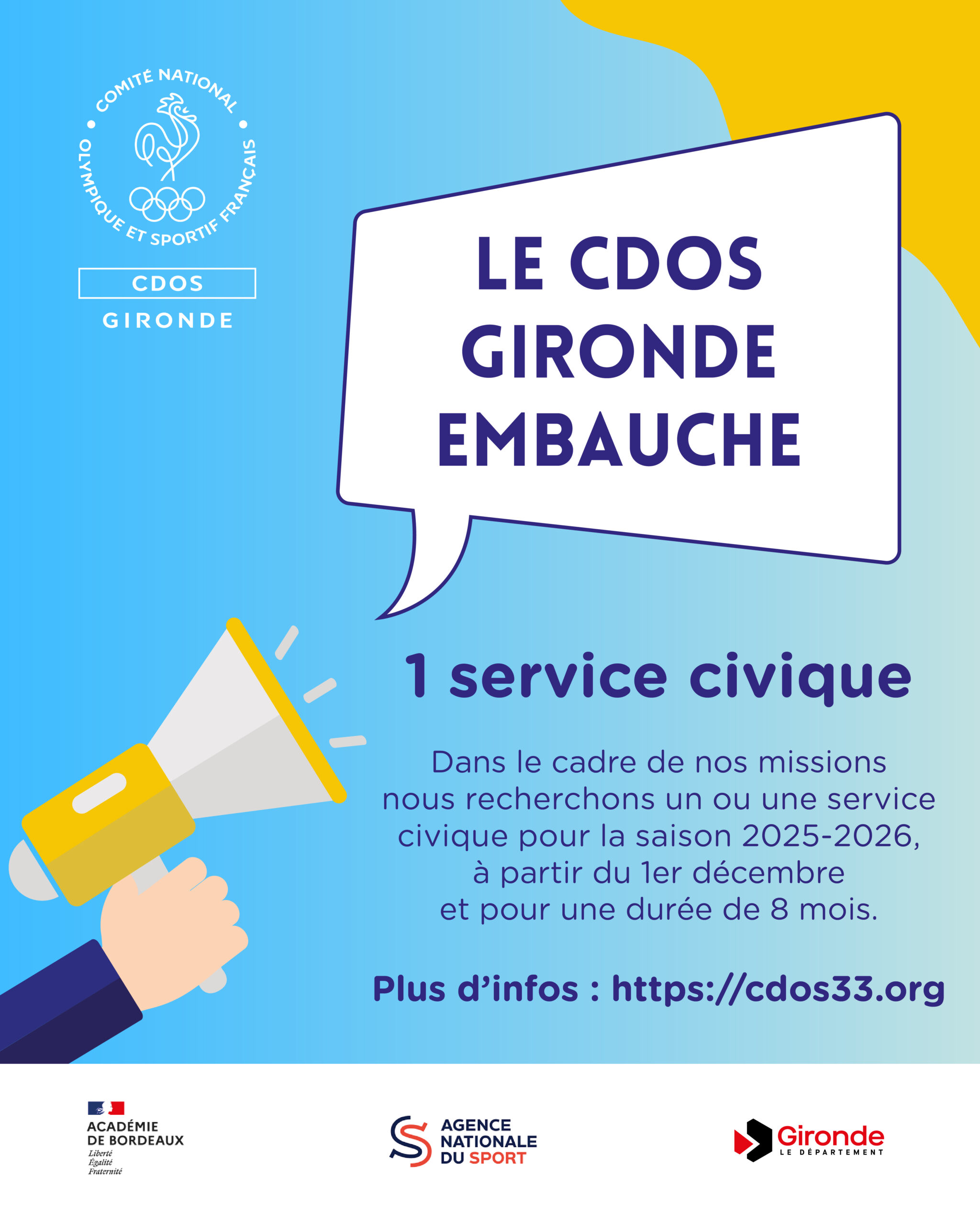 Dans le cadre de ses missions le CDOS 33 recherche un ou une service civique pour la saison 2025-2026, à partir du 1er décembre et pour une durée de 8 mois.
