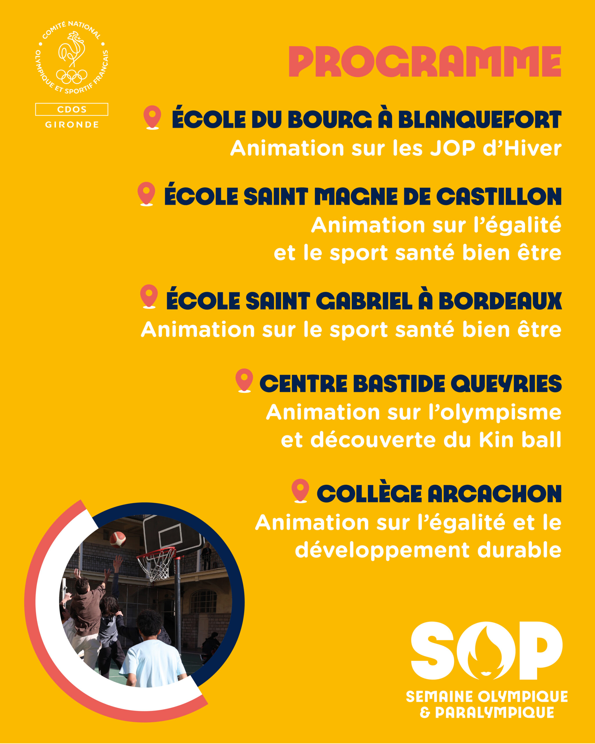 Merci aux établissements de nous recevoir pour des sensibilisations et animations autour de l'Olympisme, de l'Égalité, du Sport Santé Bien-Être et du Développement Durable !